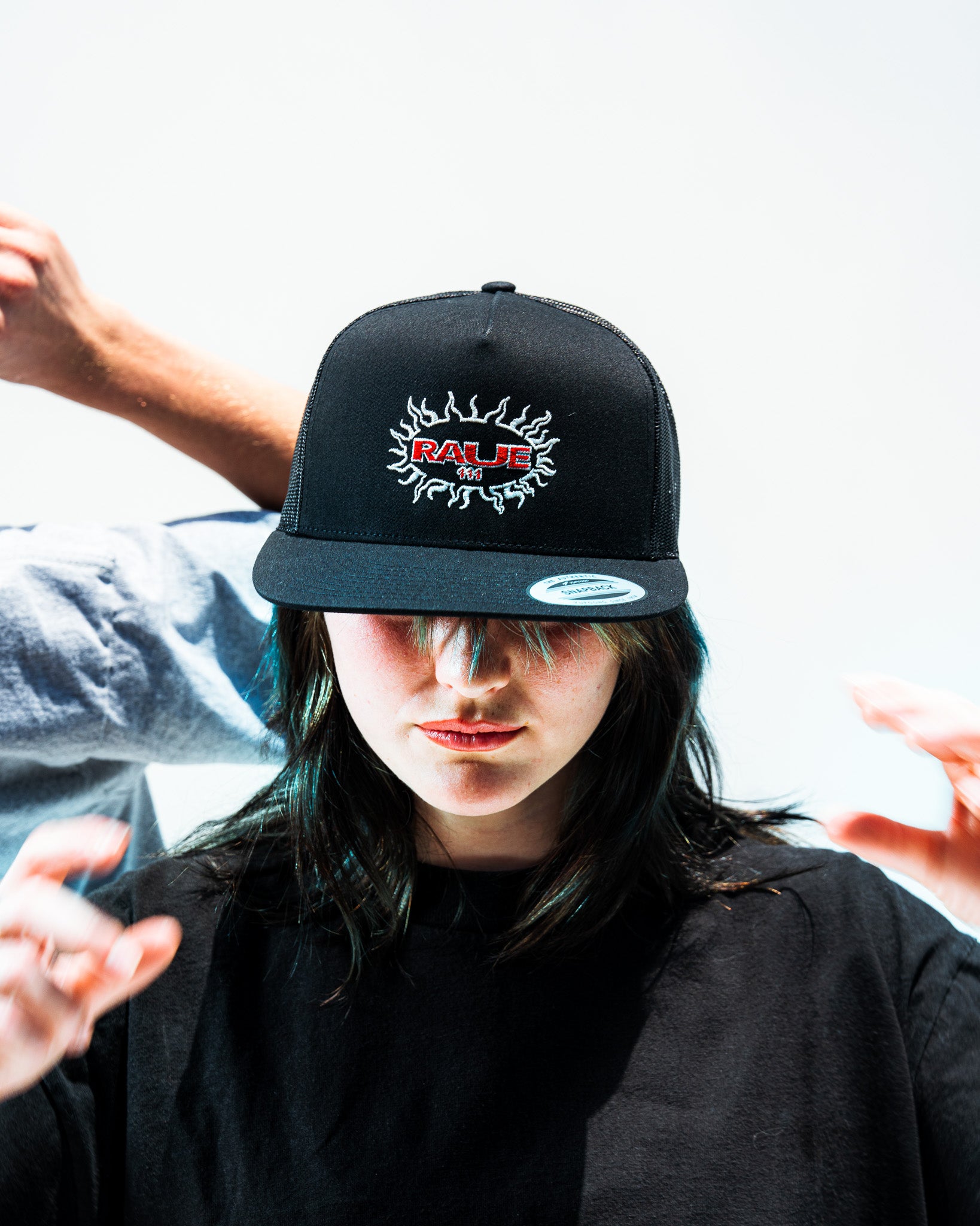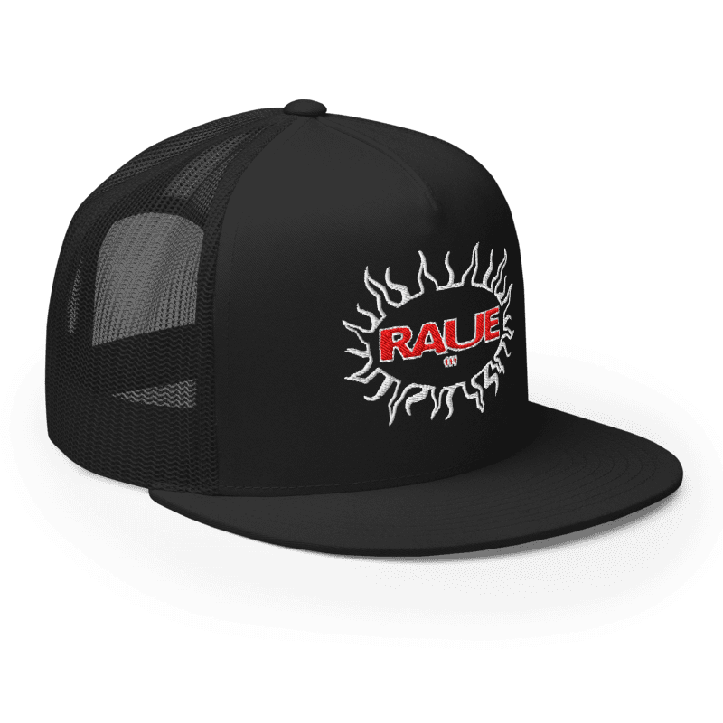 Black trucker hat with "Raue" logo featured on the front of the hat.